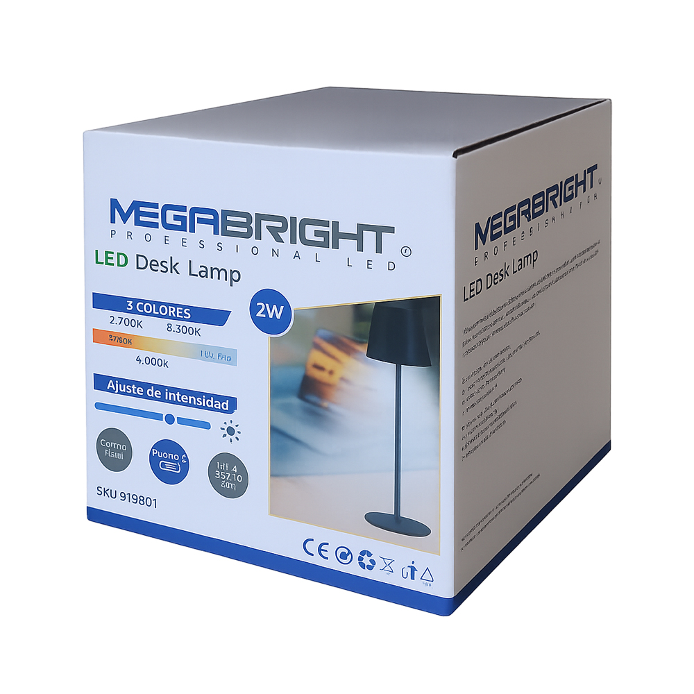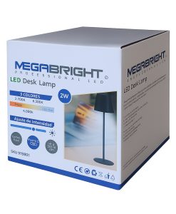Lámpara de mesa recargable Megabright 2W con 3 tonos de luz, batería 1800mAh, autonomía de 8 a 12 horas y carga USB Tipo C.